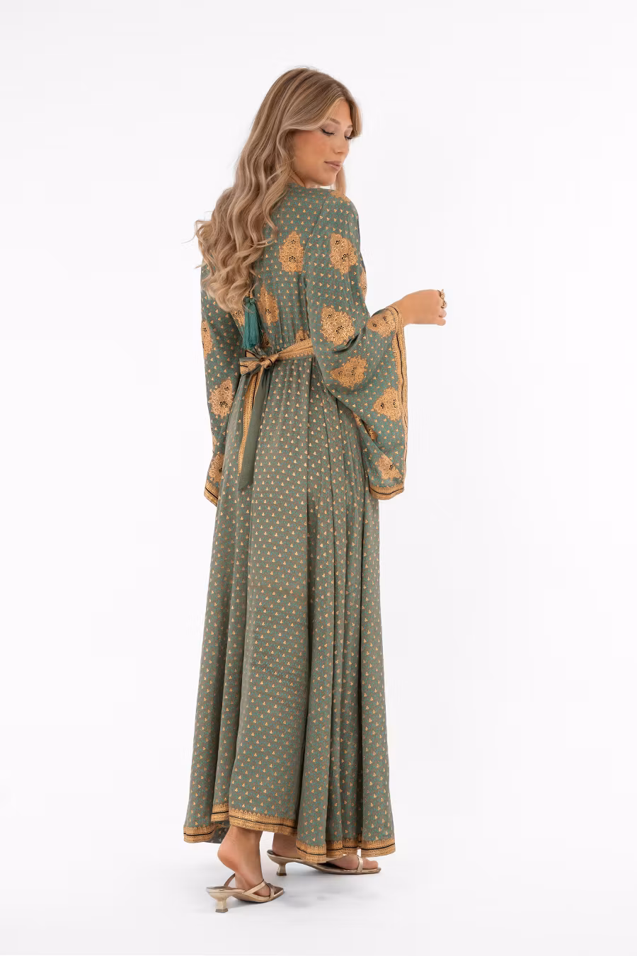 Ayla Klänning – sommarklänning i turkost och guld med v-ringning fram och bak, justerbart knytband och slits. Feminin och bohemisk stil för alla tillfällen.Ayla