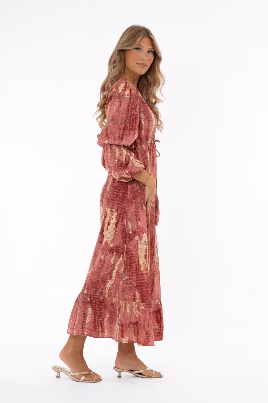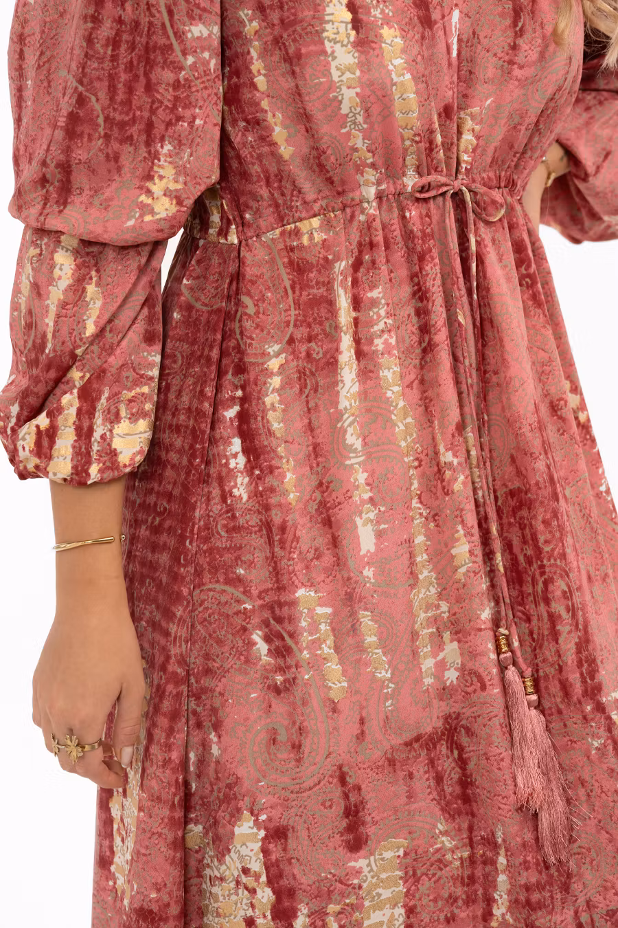 Ljuvlig sommarklänning i vackra rosa toner med eleganta detaljer i metalliskt guld. Klänningen är v-ringad i halsen och har en smickrande avskärning i midjan både fram och bak, med knytband framtill och resår baktill för bästa passform. Kjoldelen är vid och avslutas med en bred volang som ger rörelse och ett feminint fall. Ärmarna är hellånga och har resår både vid armbågen och i ärmavslutet, vilket gör att du kan bära dem helt utsträckta eller drapera upp för en snyggt fallande 3/4-längd.