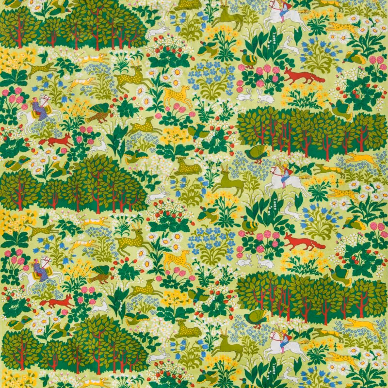 Kuddfodral Jakten, Ulla Eson Bodins klassiska mönster från 1970-talet är tryckt på ett bomullstyg. Ett härligt retromönster som finns i en blå och en brun färgställning.