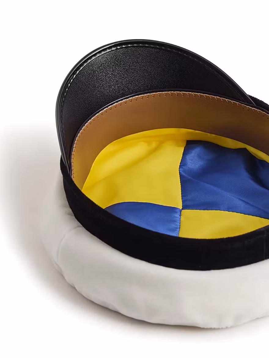 Den klassiska studentmössan i Uppsalamodell har en svart strimmel, vit kulle i finaste sammet, hattrem i äkta läder och blågult foder. Kokarden framtill på möss